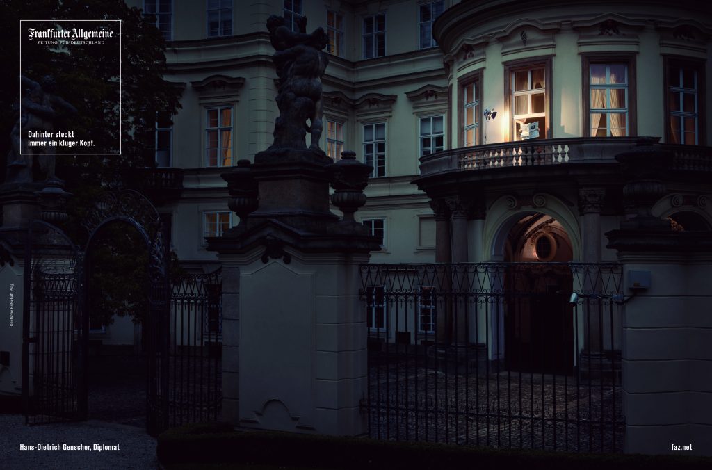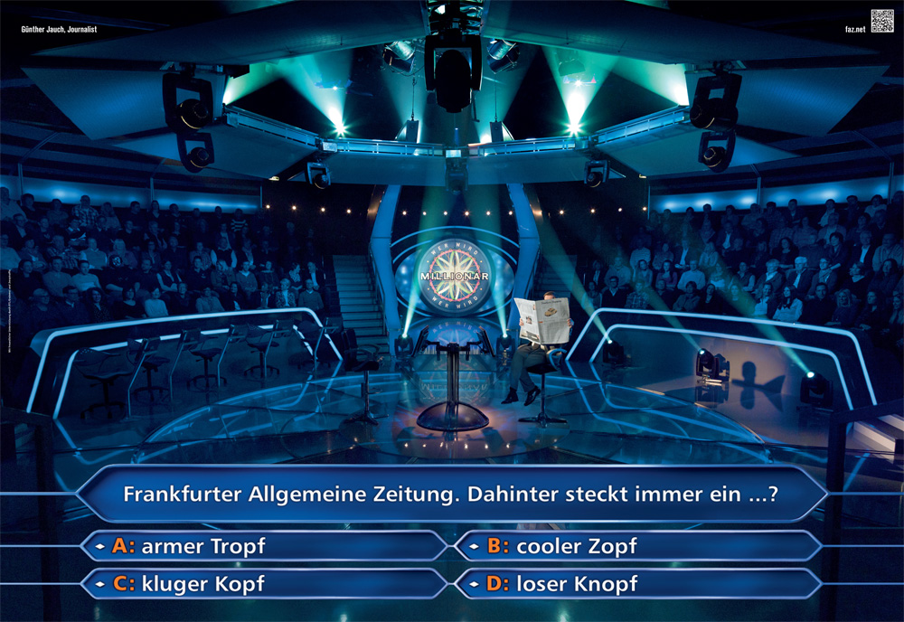 Kommen wir zur einzigen wirklich gelungenen Testimonial-Kampagne – diejenige der FAZ. Sie überrascht, weil man den Promi nicht sieht. Dies führt dazu, dass man selbst die Auflösung sucht. Die Einbettung in die Umgebung lässt sehr viele Spielereien offen und der Claim ist noch klüger als der Zeitungsleser.