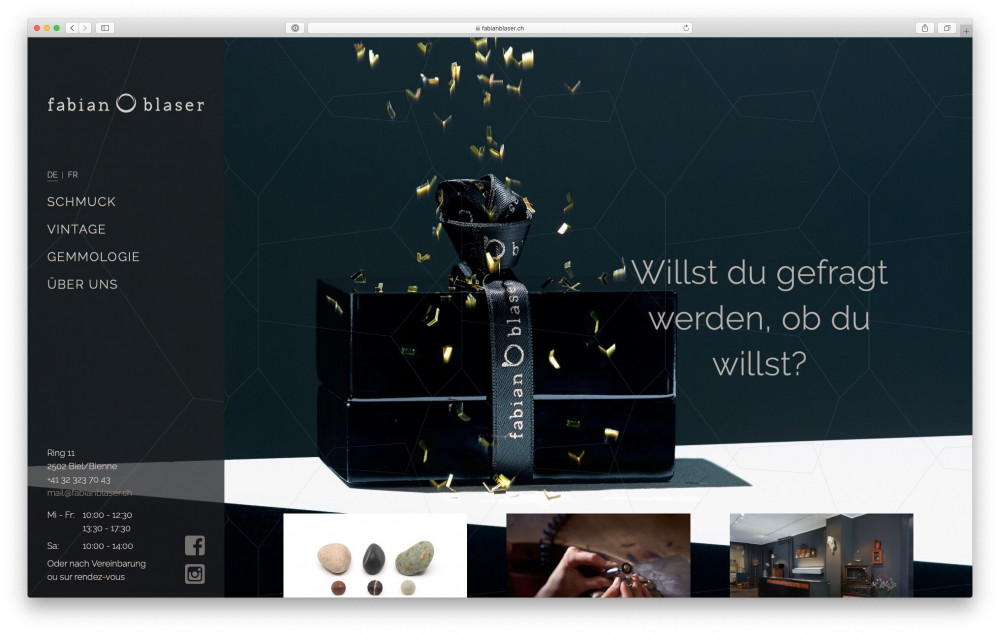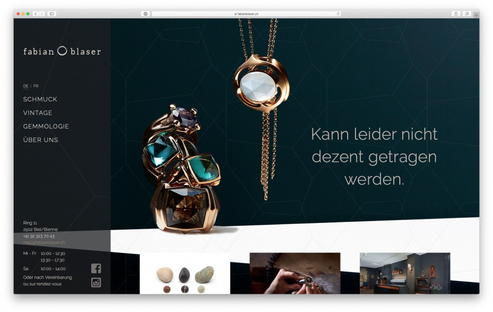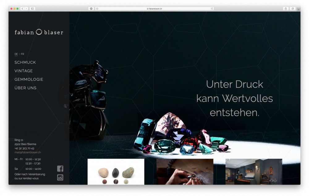 Der Bieler Goldschmied Fabian Blaser kann zwar nicht Blei zu Gold, aber Kieselsteine zu Schmuck verarbeiten. Für seine neue Website Ende 2019 liess er den Text von mir überarbeiten
