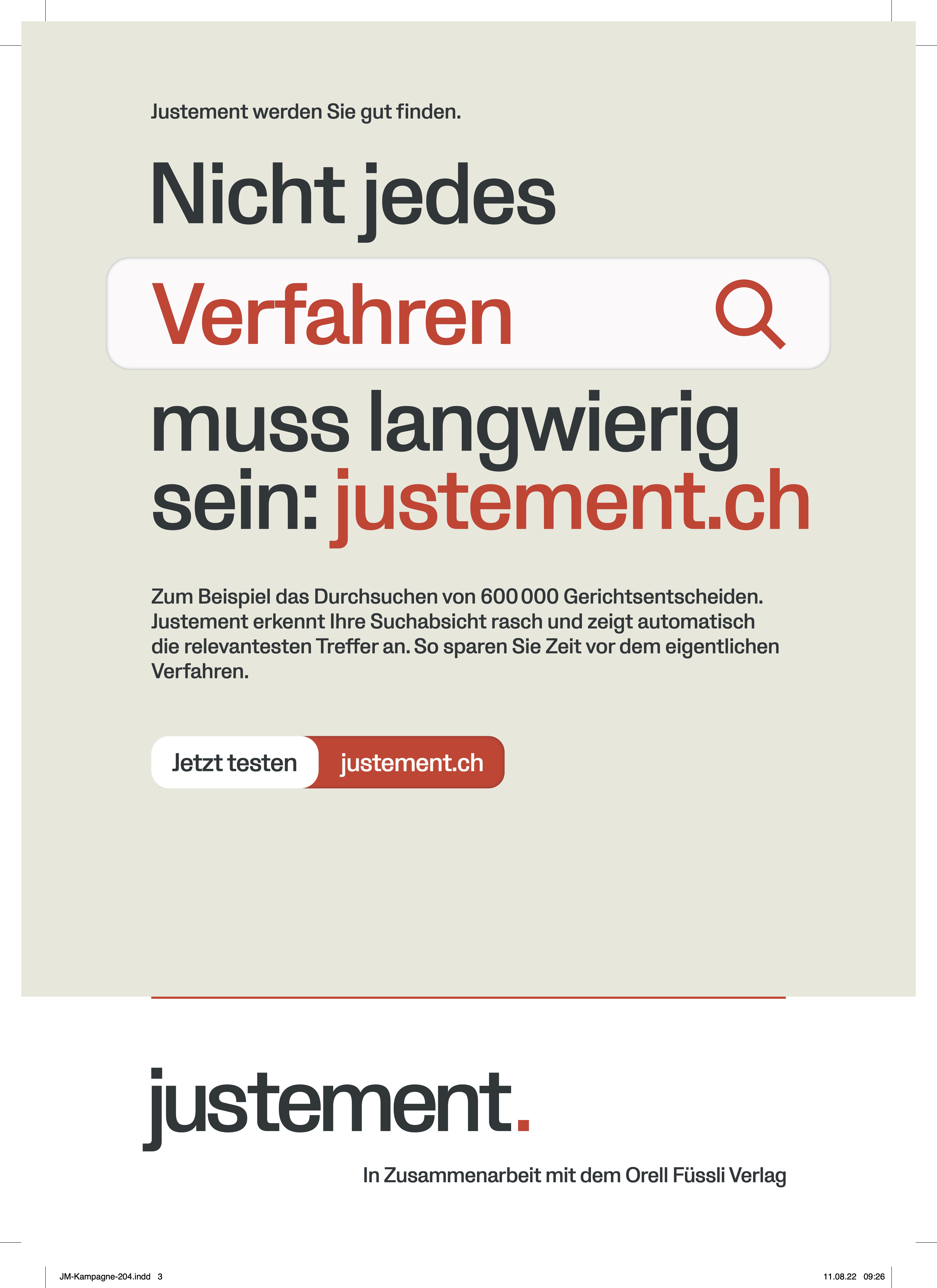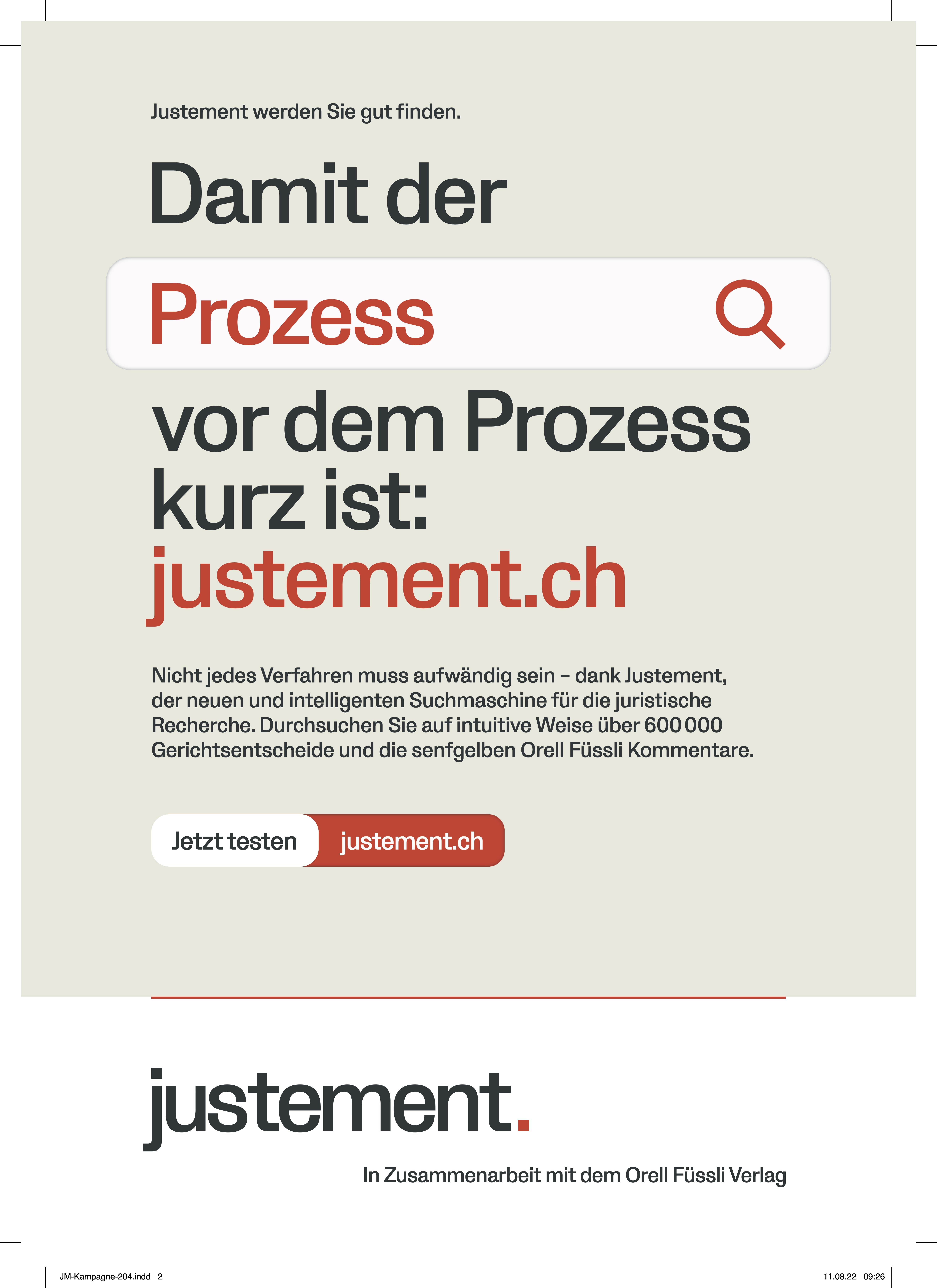 Justement und der Orell Füssli Verlag mit seinen juristischen Fachmedien gingen eine Zusammenarbeit ein. Im Rahmen dessen wurde eine Kampagne gesucht, welche Justement bei Anwaltskanzleien bekannt macht.