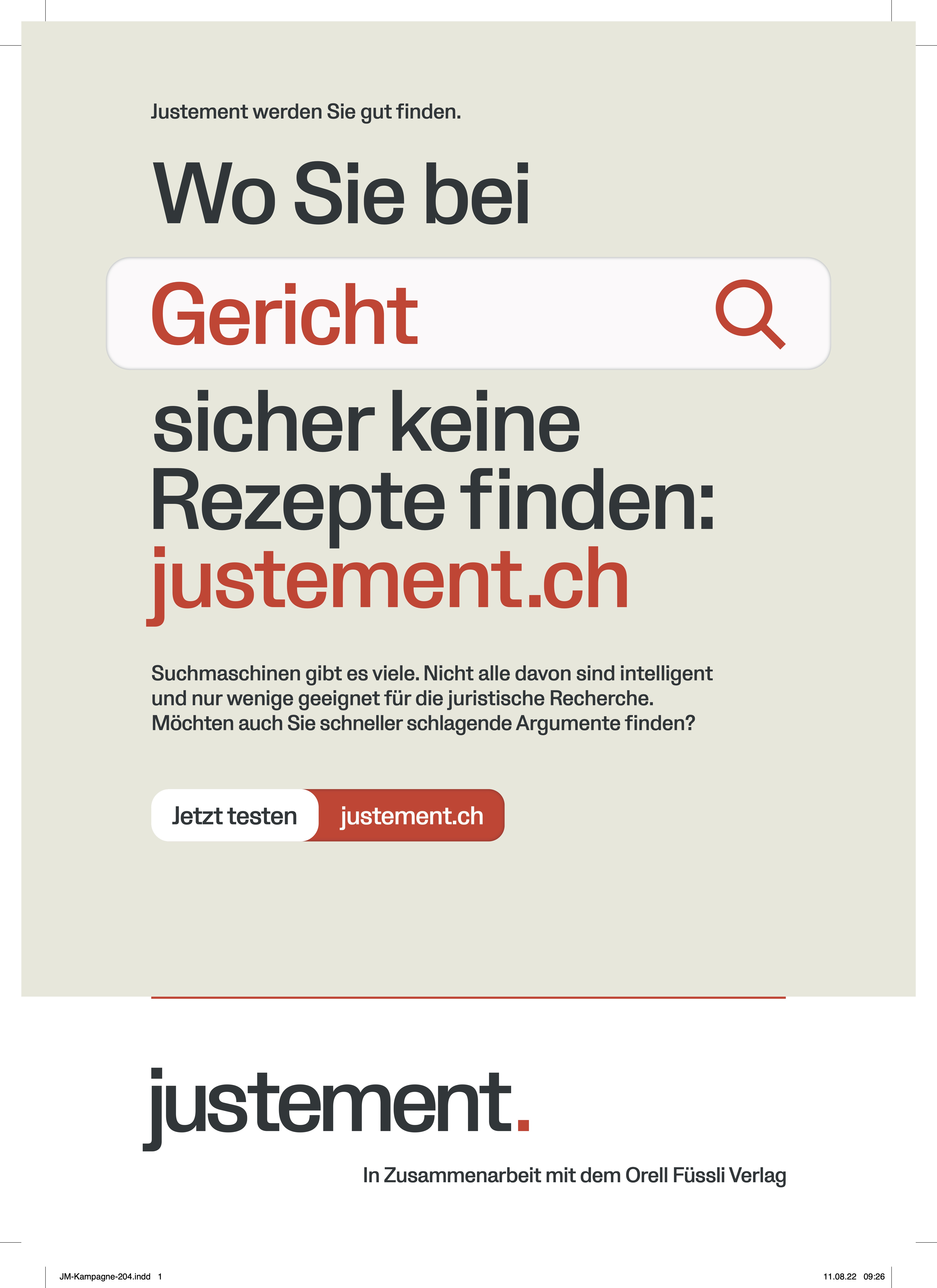 Justement und der Orell Füssli Verlag mit seinen juristischen Fachmedien gingen eine Zusammenarbeit ein. Im Rahmen dessen wurde eine Kampagne gesucht, welche Justement bei Anwaltskanzleien bekannt macht.
